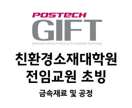 친환경소재대학원 전임교원 초빙(금속재료 및 공정) 포항공과대학교 친환경소재대학원 전임교원 초빙 (금속재료 및 공정) 금속재료 및 공정 분야에서 세계 최고 수준의 성과를 지향하는 포항공과대학교 친환경소재대학원에서 교육과 연구에서 탁월한 역량을 갖추신 분을 우리 학과의 전임교원으로 초빙하고자 합니다. ○  초빙 분야 및 인원–      금속재료 및 공정(물리야금) : 1명 - 상변태, 기계적..